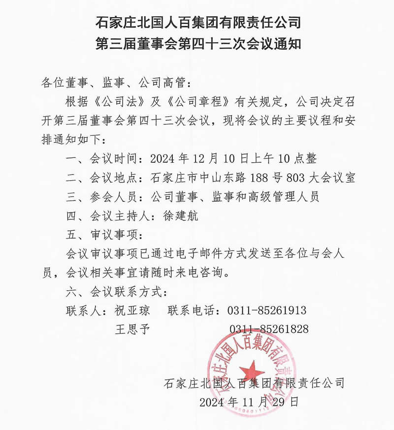 石家莊北國(guó)人百集團(tuán)有限責(zé)任公司第三屆董事會(huì)第四十三次會(huì)議通知