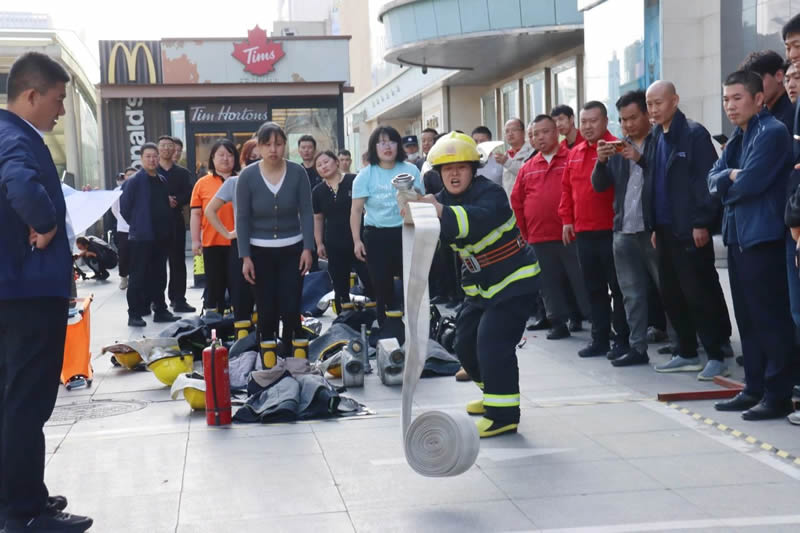 此次比武競賽以實戰形式展開,結合商場實際情況設置單人收整水帶、雙人兩盤水帶連接、單人干粉滅火器快速撲滅油火、雙人模擬救助傷員四項競賽項目。